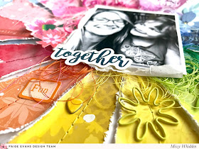 I sorted through all of the Horizon embellishments and went with a tone-on-tone effect. I used pieces from the Floral Die Cuts, Epoxy Stickers, Stickers, and Chipboard Stickers. I also used two of the adorable floral Shaped Paper Clips. I also used the same colors of thread and created little messy tangled nests of each color around the photo for more texture.