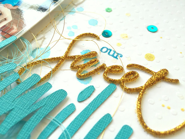 These adorable sequins are part of the On Trend line, and I made a little banner out of these cute triangles. I also scattered some of the blue and green smaller round sequins around the page and added some rub-ons. The gold puffy stickers are from the Niche line.