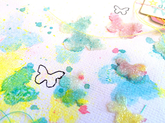 Here's a close up look at the stencil work. You can see the glass bead gel here...it's like a clear gel but it has these tiny glass bead in it. It's really pretty and gives amazing texture. Once it dried, I used a small paintbrush to add a bit of Shimmerz to them. The inks I used for this are all from Shimmerz. Some of the butterflies were a bit messy and abstract from the stamping, but I love how that turned out.